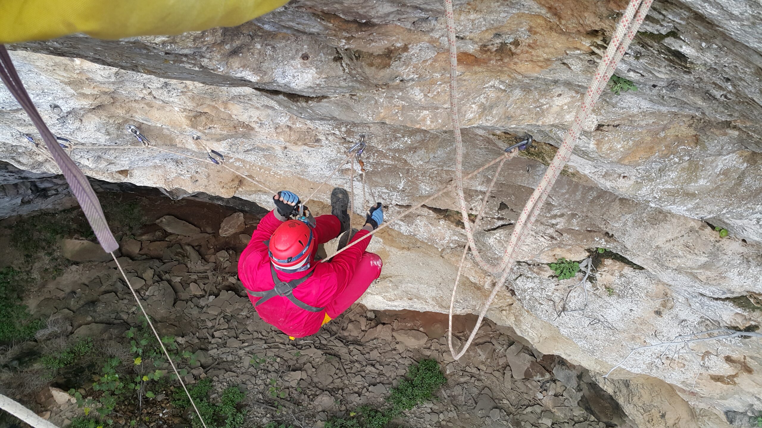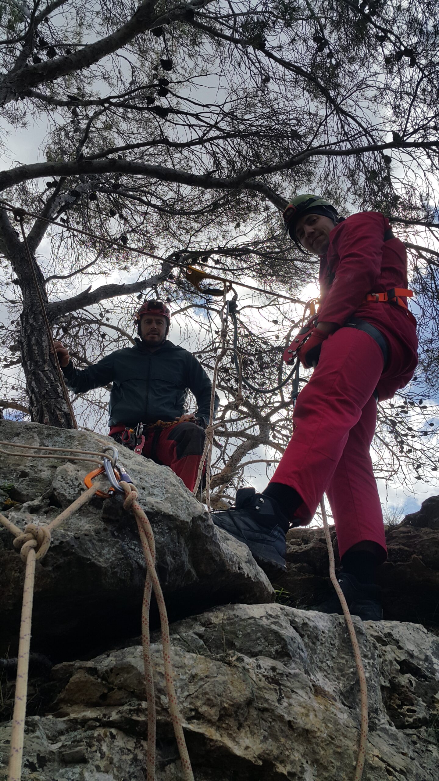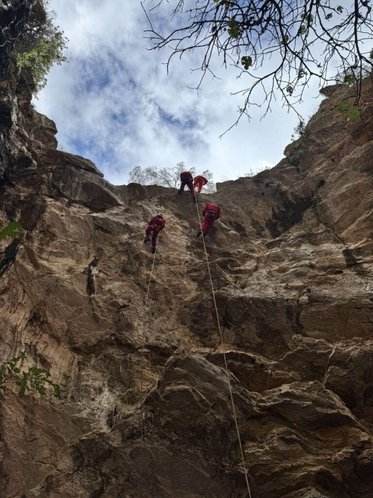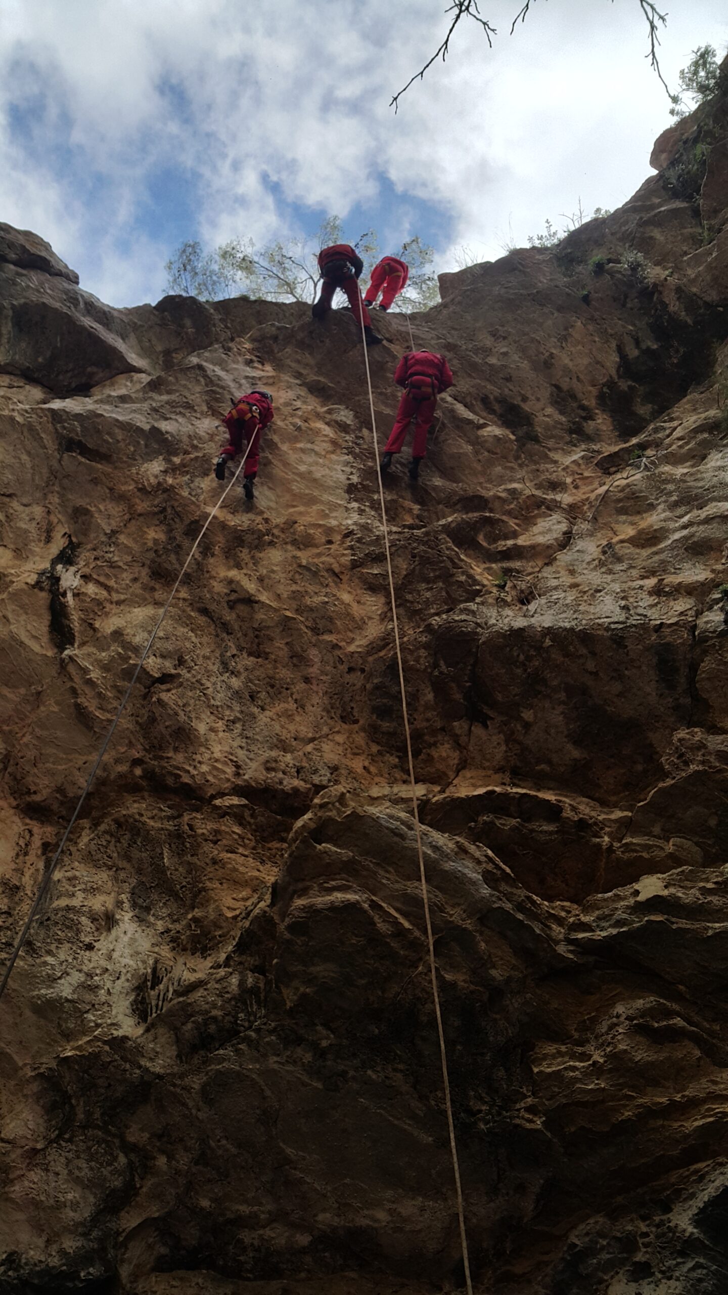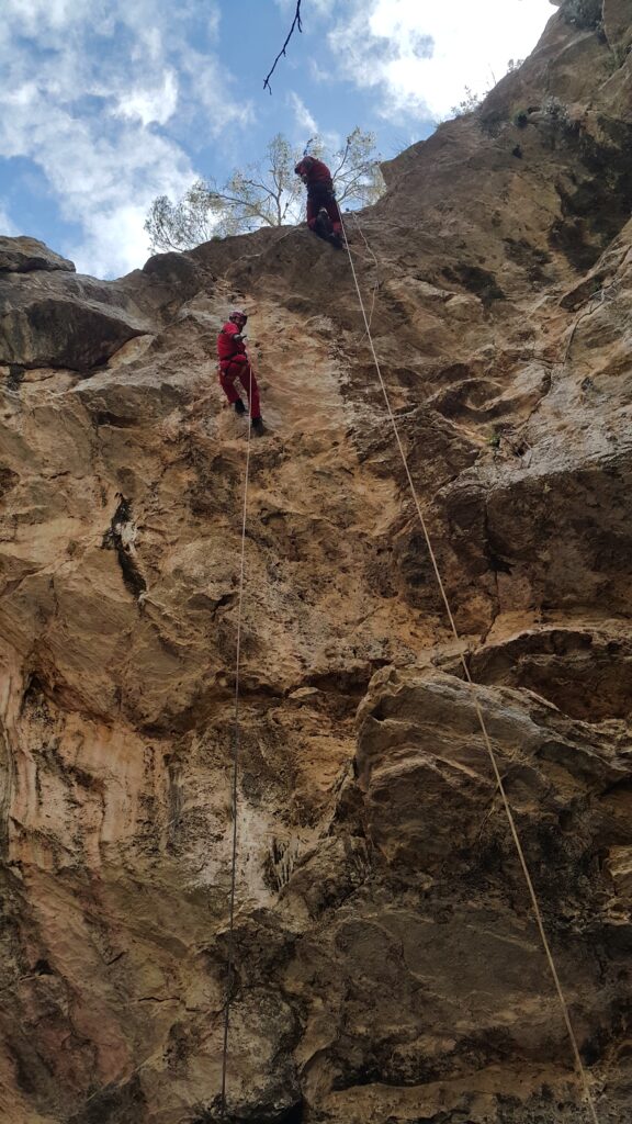 Ξεκινήσαμε με καταβάσεις του «φορείου». προωθήσαμε δηλαδή άτομο από τη ζώνη του χωρίς άλλο βοήθημα, αλλά με σύστημα ανάρτησης σε πλακέτα πολλαπλών σημείων, είτε για κατάβαση, είτε για ανάβαση και βέβαια ασφάλιση. Περάσαμε το «φορείο» από παρακάμψεις και μιάς και ήμασταν σε πολύ εύκολα προσβάσιμο πεδίο, κάναμε αρκετές επαναλήψεις, με εναλλαγή ρόλων. Δοκιμάσαμε το Βουλγάρικο πολύσπαστο που λειτουργεί πολύ καλά, αλλά όχι με όλα τα καραμπίνερ, όπως και τη μισή ψαλιδιά , για την ανύψωση του βάρους και τη μεταφορά σε άλλη γραμμή. Όρεξη να υπάρχει, έχουμε πολλά ακόμα να δουλέψουμε.