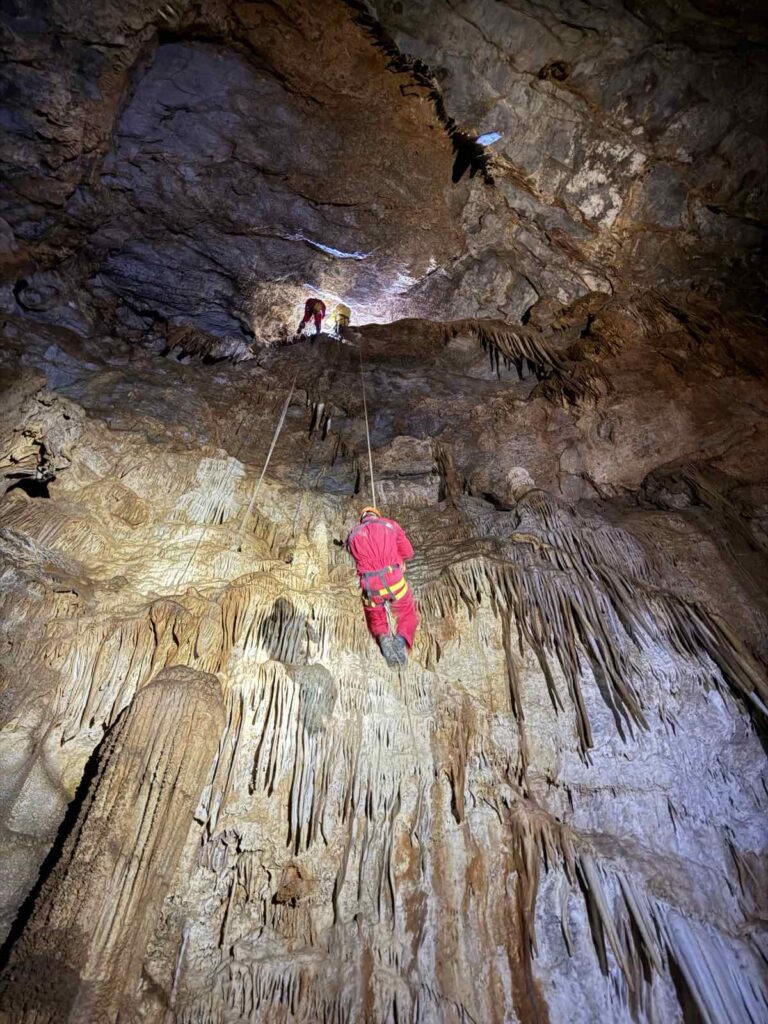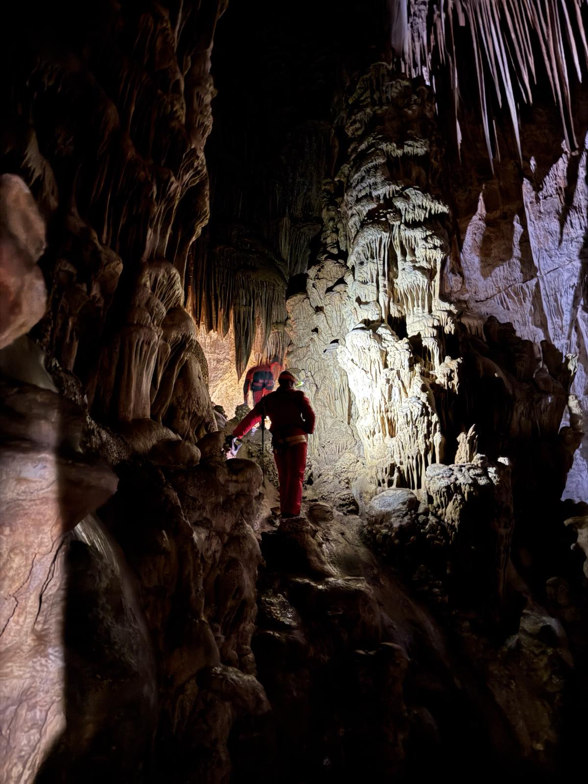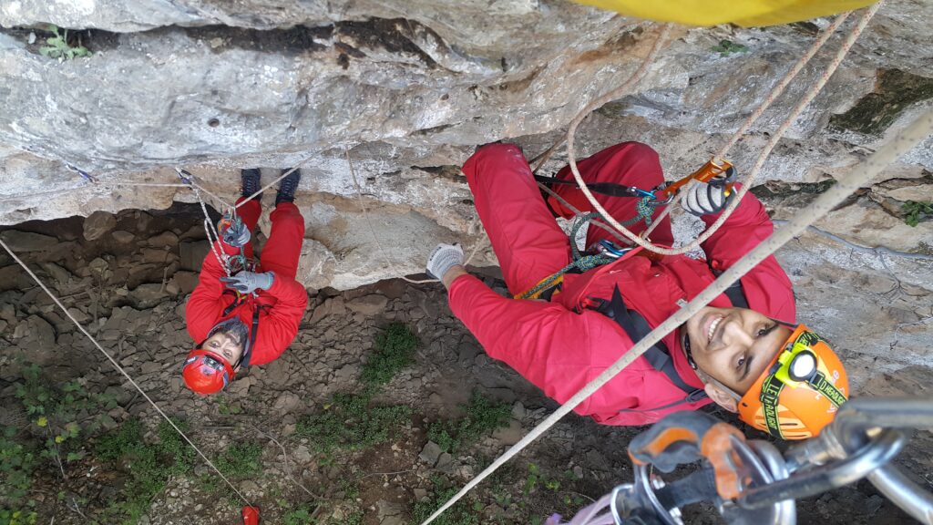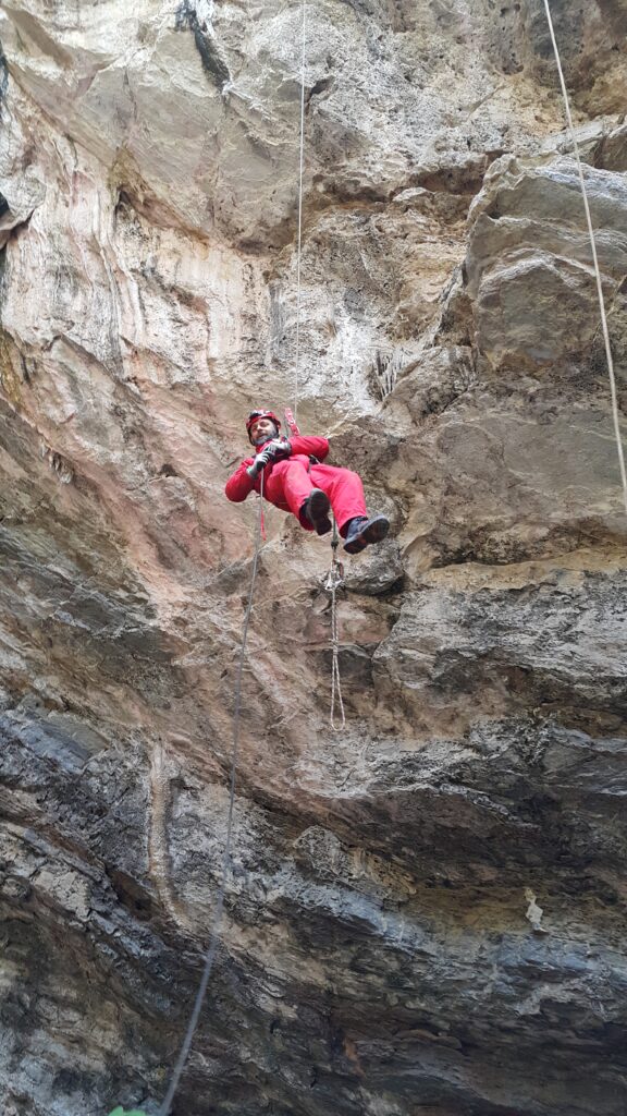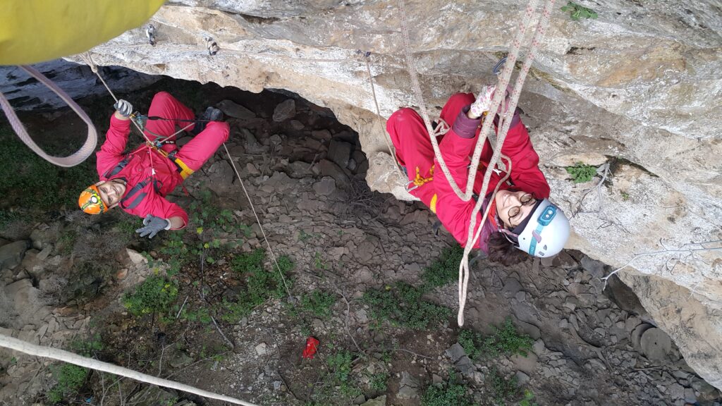 Αυτό το σπήλαιο, συνήθως το χρησιμοποιούμε για εκπαίδευση, κατεβαίνοντας μόνο μέχρι την πρώτη αίθουσα, κάνοντας τεχνικές και περνώντας ένα πρώτο, σχεδόν οριζόντιο στένεμα που έχει εκεί, για εγκλιματισμό στα δύσκολα περάσματα. Αμέσως μετά από αυτό όμως, ακολουθεί ένα ακόμα στενότερο, με την πρόσθετη δυσκολία, ότι είναι κάθετο και πρέπει να χειρίζεσαι το σχοινί. Ο καταβατήρας δεν χωράει στον κεντρικό, γιατί πλακώνεται πολύ στο βράχο από την κοιλιά και το θώρακα και δεν τρέχει το σχοινί για να κατέβεις. Αναγκαστικά λοιπόν τον προσαρμόζουμε σε προέκταση, λίγο ψηλότερα από το πρόσωπό μας, ώστε να λειτουργεί. Αμέσως μετά, υπάρχει αγκύρωση, στην οποία πρέπει να κρεμαστούμε και εκεί να γίνει αποκατάσταση του καταβατήρα στη σωστή του θέση, ενώ αιωρούμαστε στο κενό. Ένας αρκετά σύνθετος χειρισμός, με την προϋπόθεση ότι πρέπει να τηρηθούν οι κανόνες ασφαλείας.