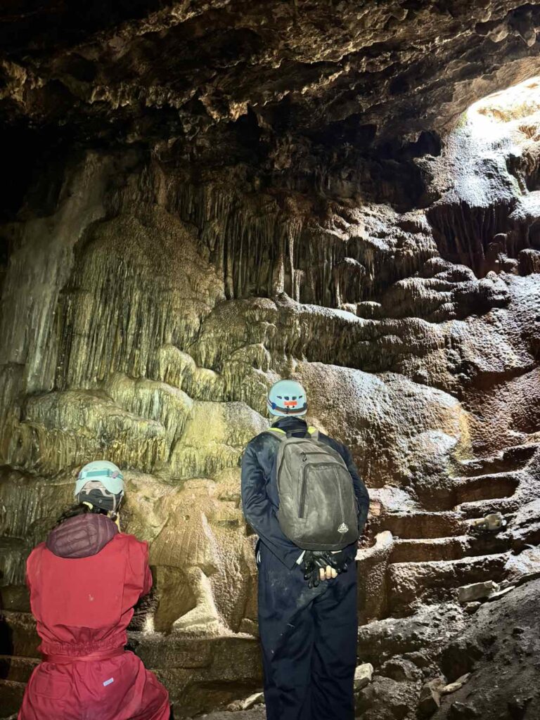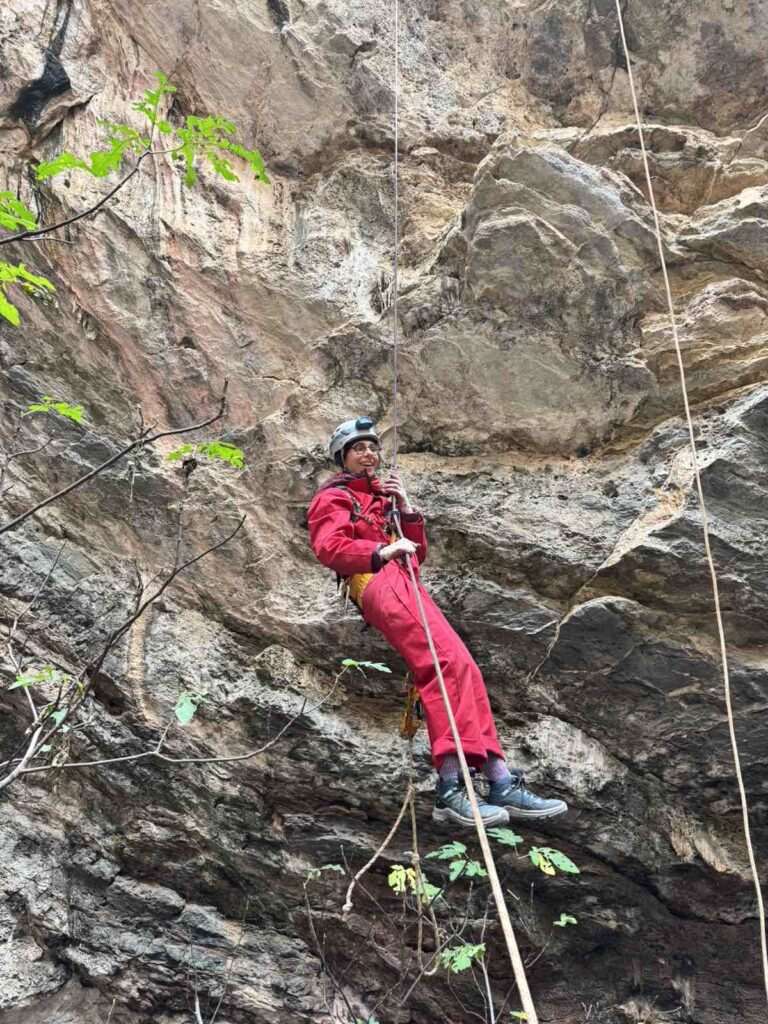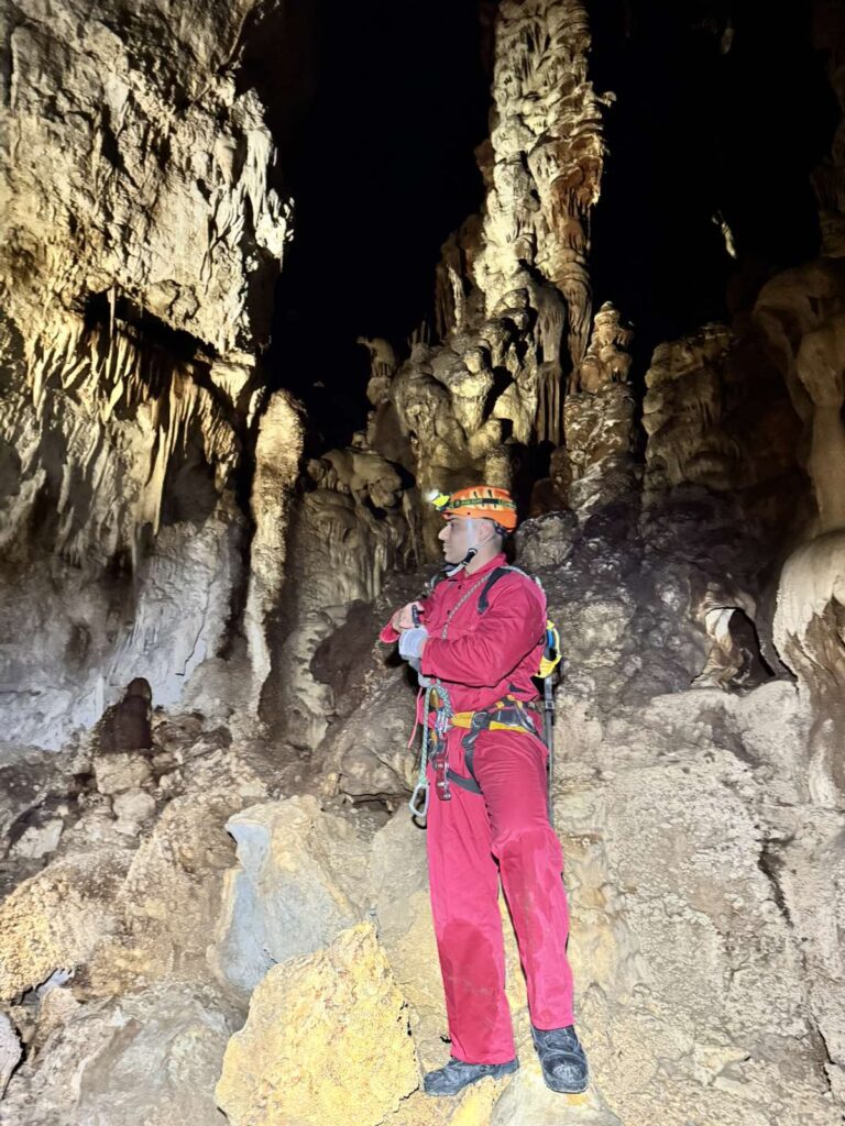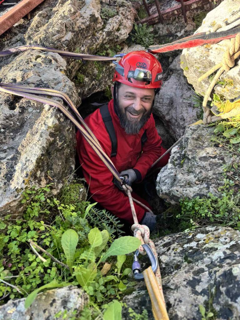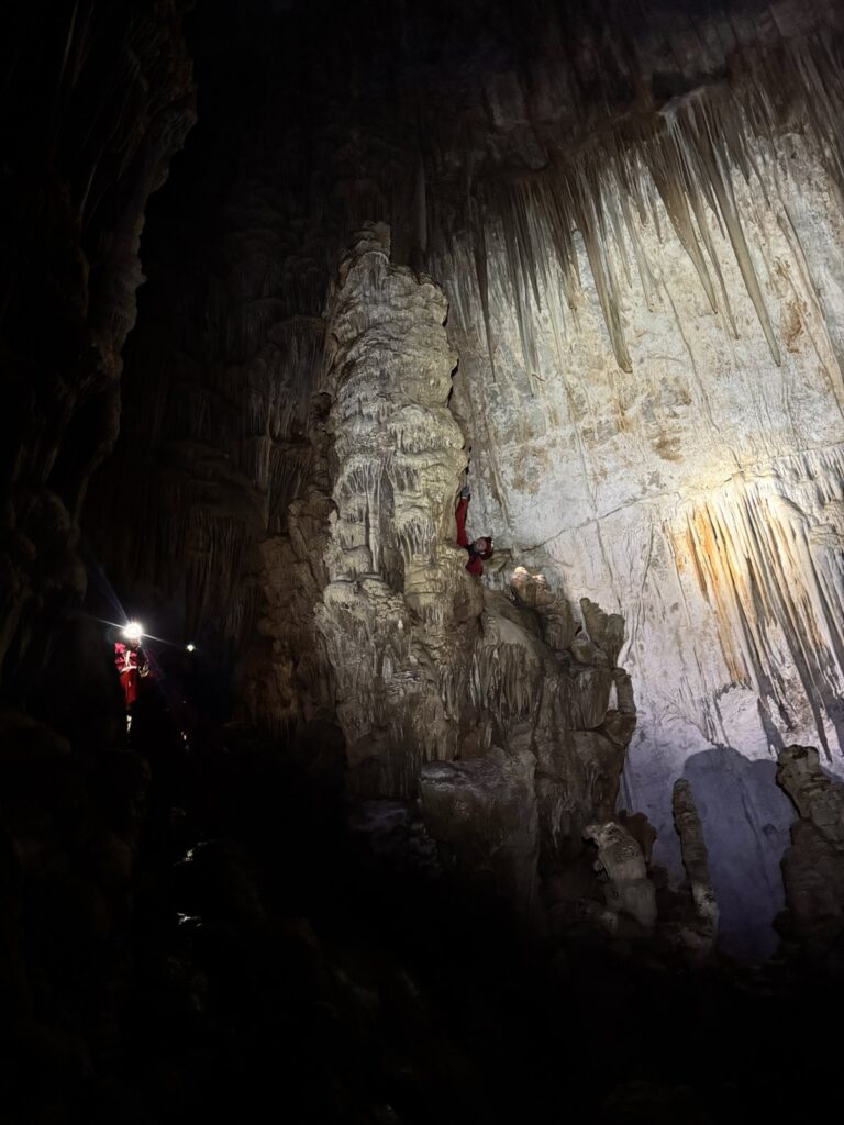 Αυτό το σπήλαιο, συνήθως το χρησιμοποιούμε για εκπαίδευση, κατεβαίνοντας μόνο μέχρι την πρώτη αίθουσα, κάνοντας τεχνικές και περνώντας ένα πρώτο, σχεδόν οριζόντιο στένεμα που έχει εκεί, για εγκλιματισμό στα δύσκολα περάσματα. Αμέσως μετά από αυτό όμως, ακολουθεί ένα ακόμα στενότερο, με την πρόσθετη δυσκολία, ότι είναι κάθετο και πρέπει να χειρίζεσαι το σχοινί. Ο καταβατήρας δεν χωράει στον κεντρικό, γιατί πλακώνεται πολύ στο βράχο από την κοιλιά και το θώρακα και δεν τρέχει το σχοινί για να κατέβεις. Αναγκαστικά λοιπόν τον προσαρμόζουμε σε προέκταση, λίγο ψηλότερα από το πρόσωπό μας, ώστε να λειτουργεί. Αμέσως μετά, υπάρχει αγκύρωση, στην οποία πρέπει να κρεμαστούμε και εκεί να γίνει αποκατάσταση του καταβατήρα στη σωστή του θέση, ενώ αιωρούμαστε στο κενό. Ένας αρκετά σύνθετος χειρισμός, με την προϋπόθεση ότι πρέπει να τηρηθούν οι κανόνες ασφαλείας.