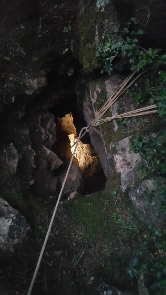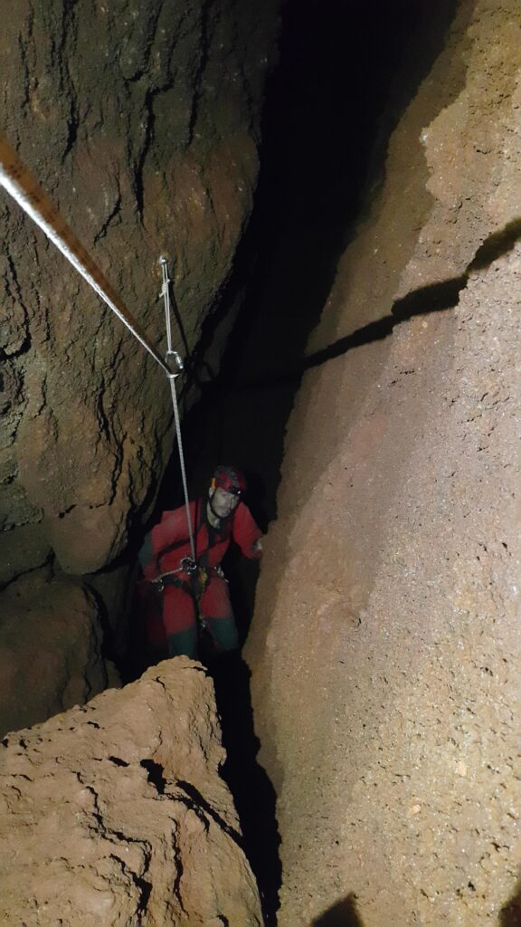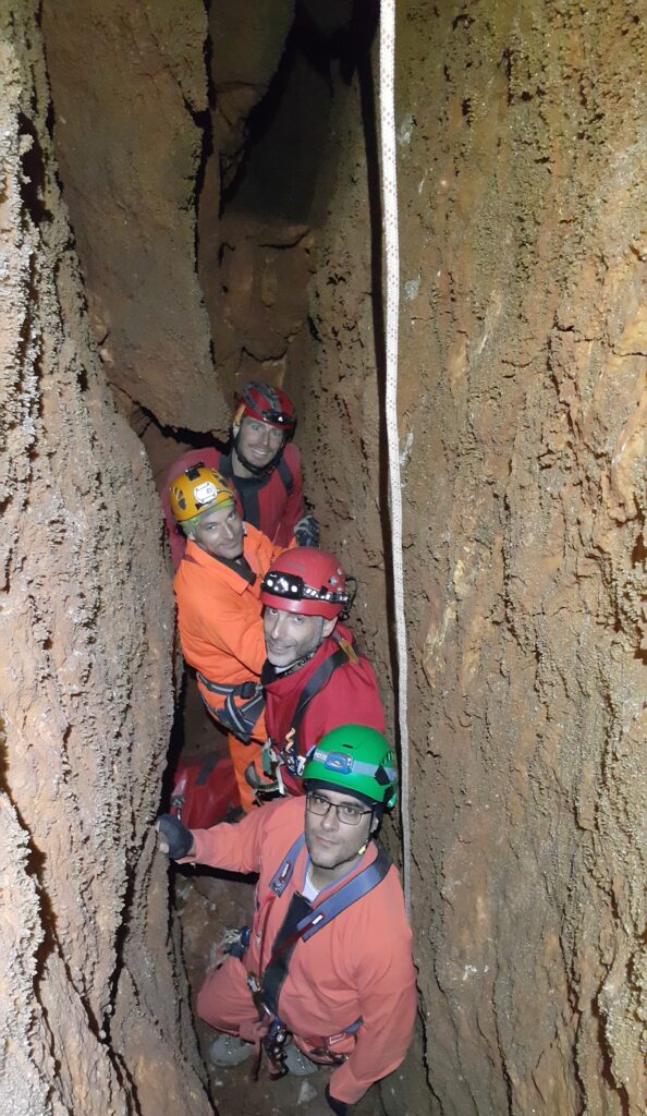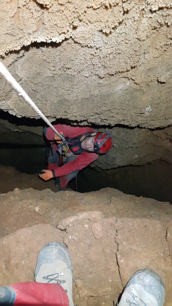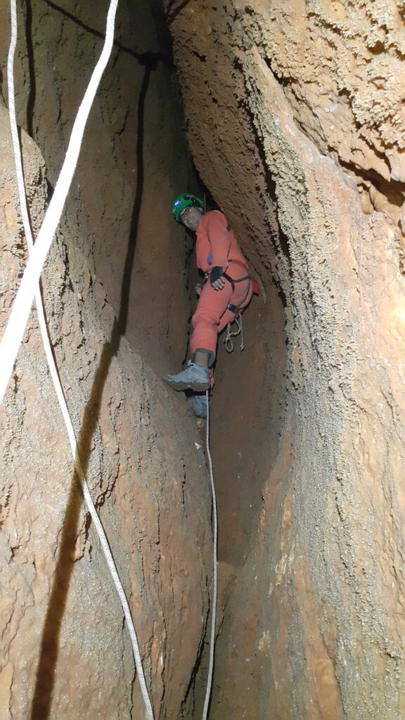Στο χαμηλοτάβανο αυτό χώρο, υπήρχαν τα ίχνη από προηγούμενες καταβάσεις, με δύο τοποθετημένα αυτοδιάτρητα βύσματα που ήταν ακόμα λειτουργικά, αλλά δεν είχαμε δεί άλλα αρματώματα προς τα κάτω και το βάθος είναι κάπου 20 μέτρα. Το αρματώσαμε και κατεβήκαμε, καταλήγοντας σε ένα διάδρομο φάρδους 30-40, ή το πολύ 50 εκατοστά σε κάποιο σημείο, με μήκος 3-4 μέτρα κι έτσι, έστω και με το ζόρι κατεβήκαμε και οι πέντε.