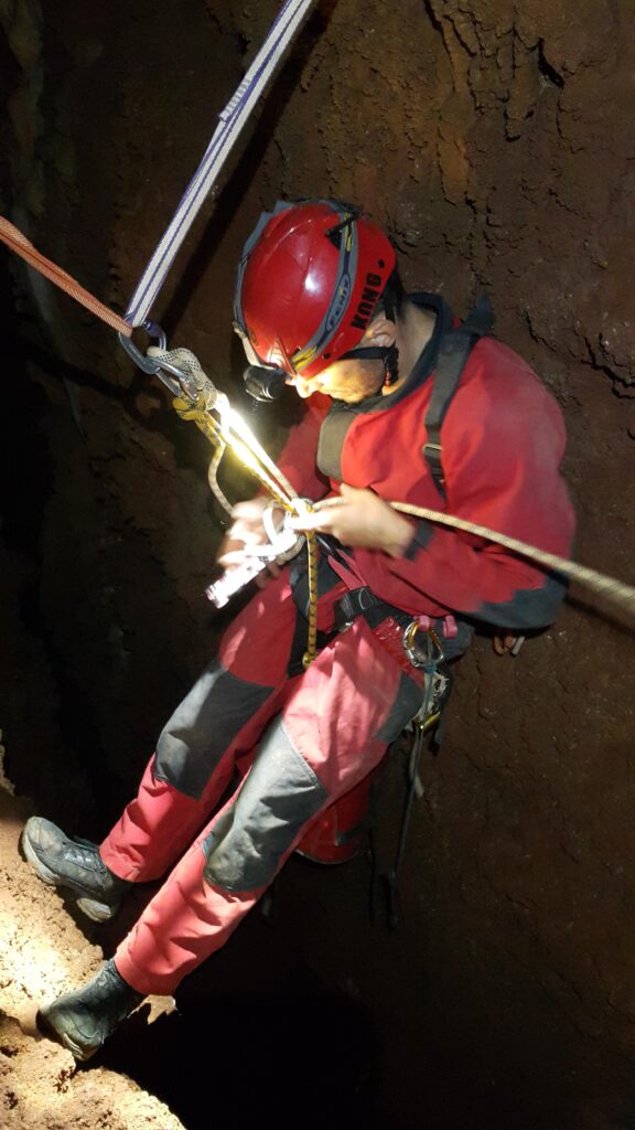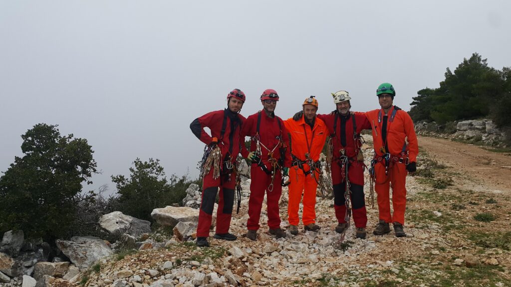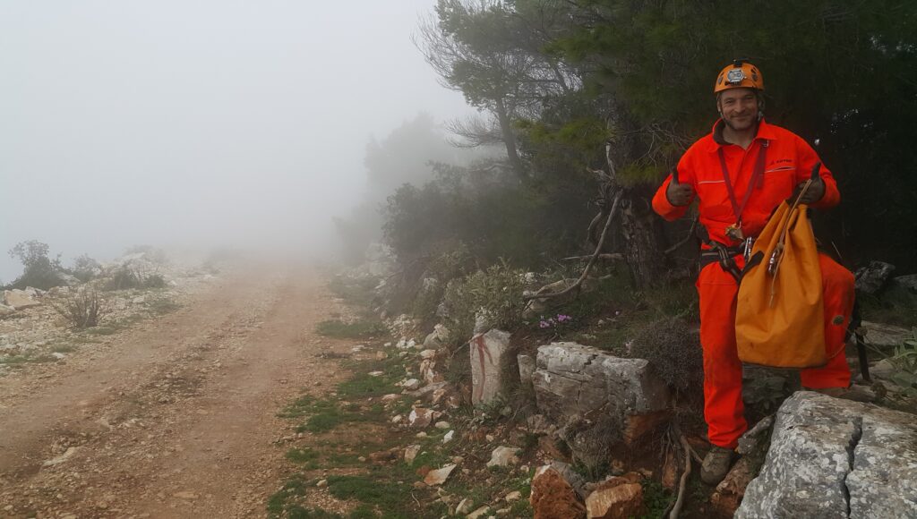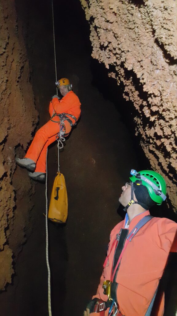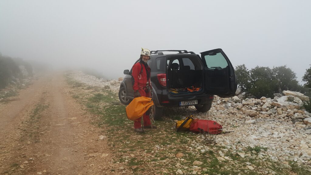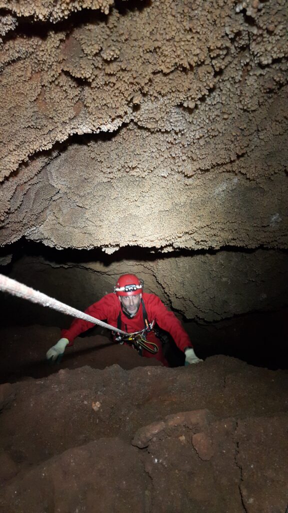 Στο χαμηλοτάβανο αυτό χώρο, υπήρχαν τα ίχνη από προηγούμενες καταβάσεις, με δύο τοποθετημένα αυτοδιάτρητα βύσματα που ήταν ακόμα λειτουργικά, αλλά δεν είχαμε δεί άλλα αρματώματα προς τα κάτω και το βάθος είναι κάπου 20 μέτρα. Το αρματώσαμε και κατεβήκαμε, καταλήγοντας σε ένα διάδρομο φάρδους 30-40, ή το πολύ 50 εκατοστά σε κάποιο σημείο, με μήκος 3-4 μέτρα κι έτσι, έστω και με το ζόρι κατεβήκαμε και οι πέντε.
