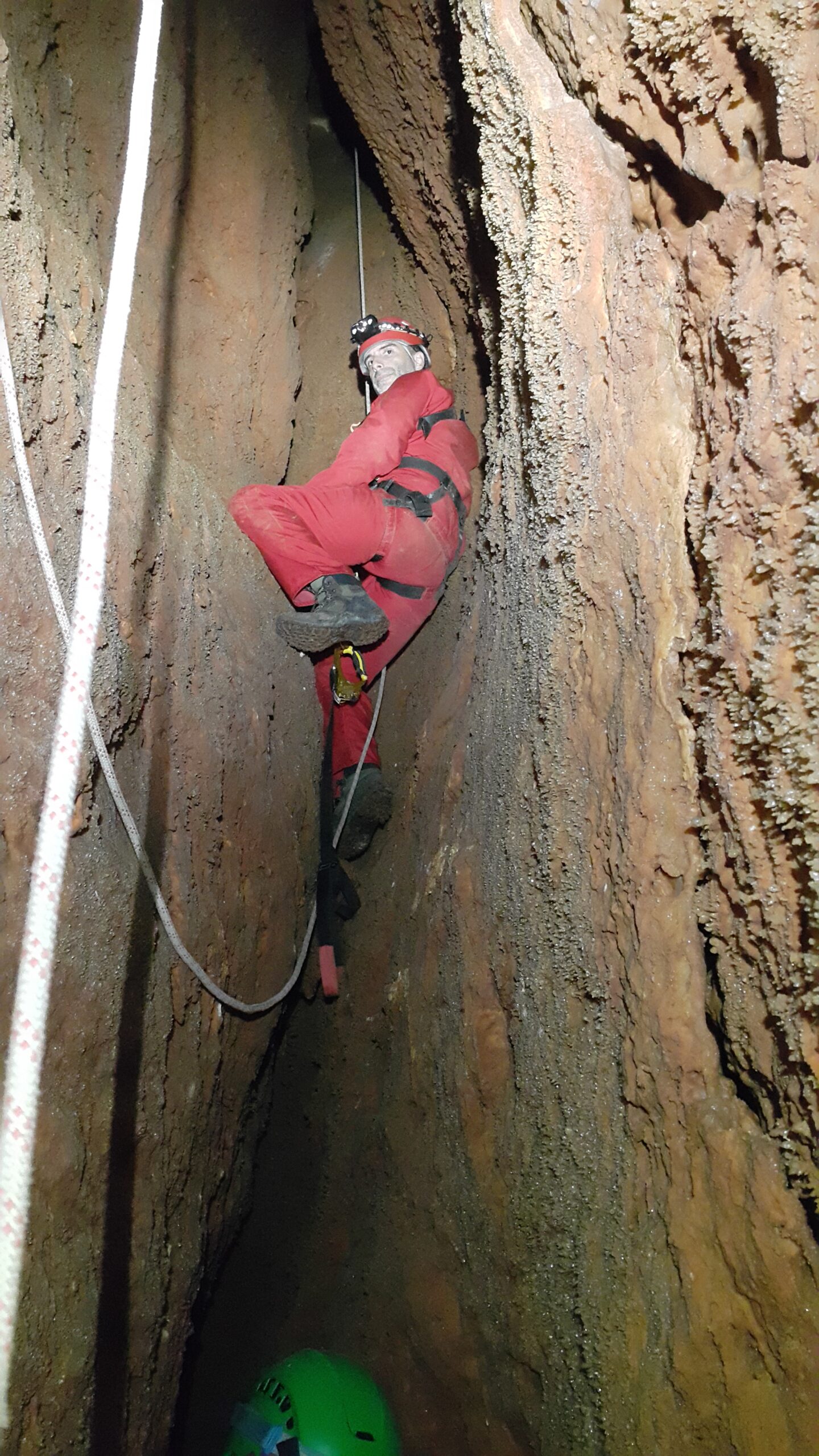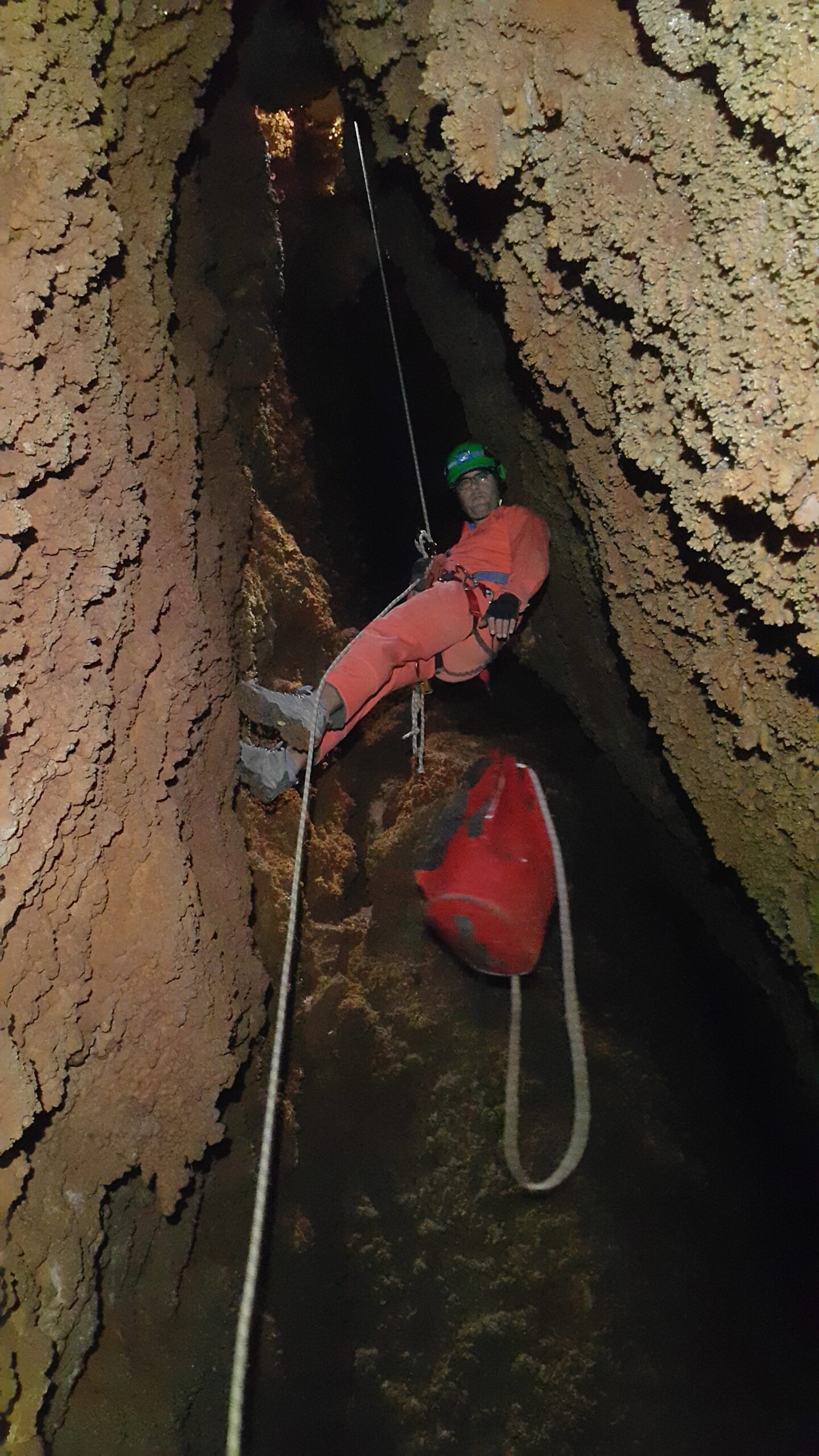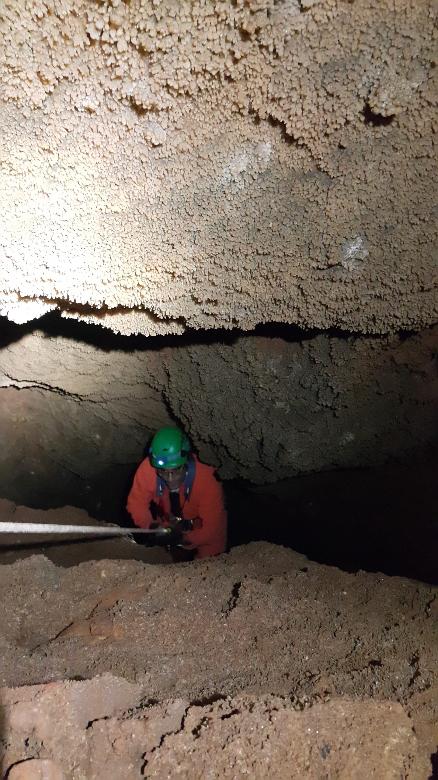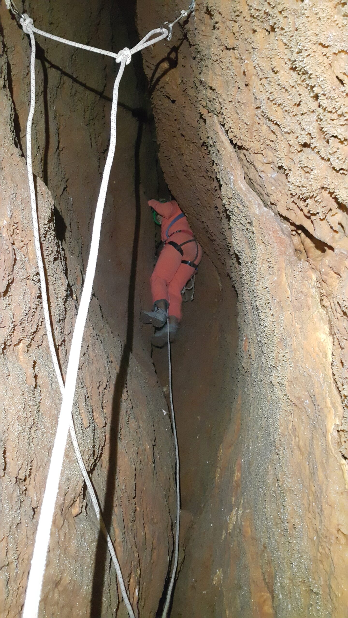 Στο χαμηλοτάβανο αυτό χώρο, υπήρχαν τα ίχνη από προηγούμενες καταβάσεις, με δύο τοποθετημένα αυτοδιάτρητα βύσματα που ήταν ακόμα λειτουργικά, αλλά δεν είχαμε δεί άλλα αρματώματα προς τα κάτω και το βάθος είναι κάπου 20 μέτρα. Το αρματώσαμε και κατεβήκαμε, καταλήγοντας σε ένα διάδρομο φάρδους 30-40, ή το πολύ 50 εκατοστά σε κάποιο σημείο, με μήκος 3-4 μέτρα κι έτσι, έστω και με το ζόρι κατεβήκαμε και οι πέντε.
