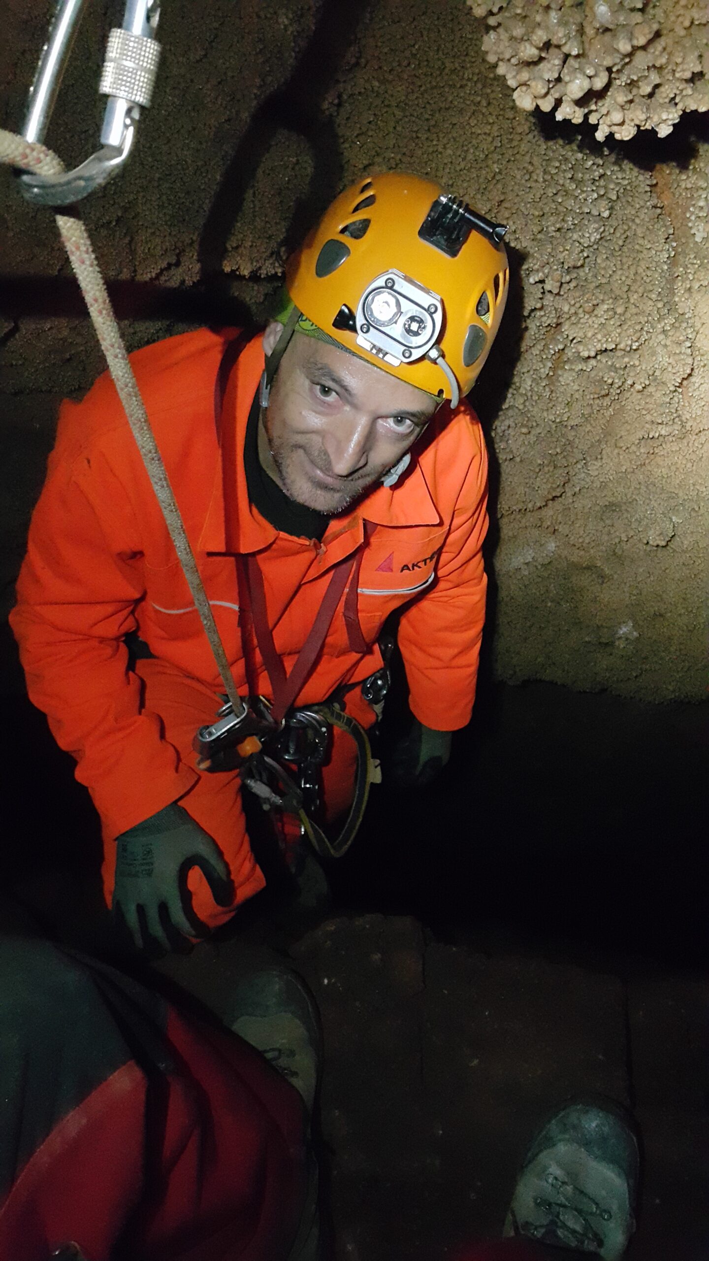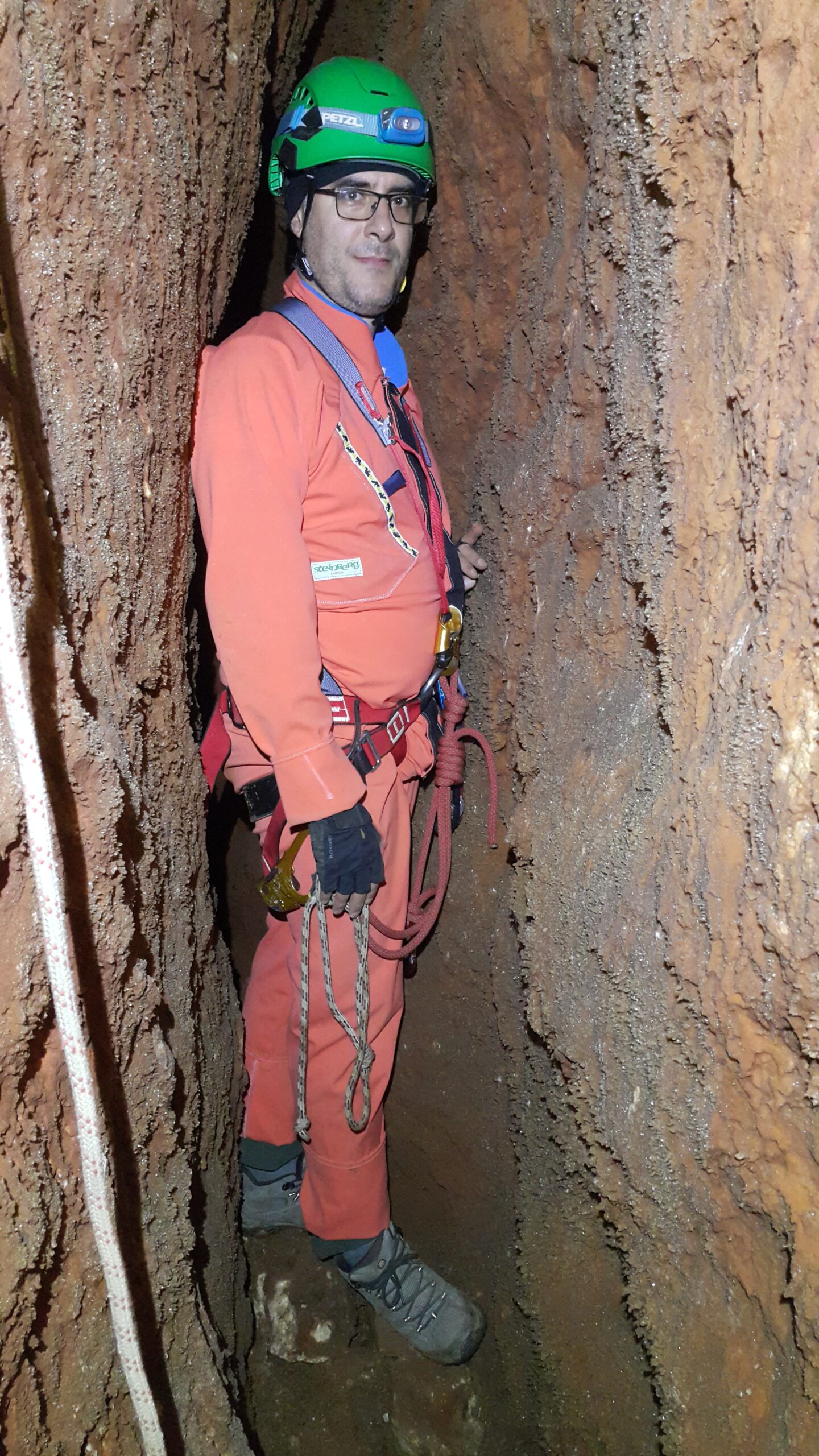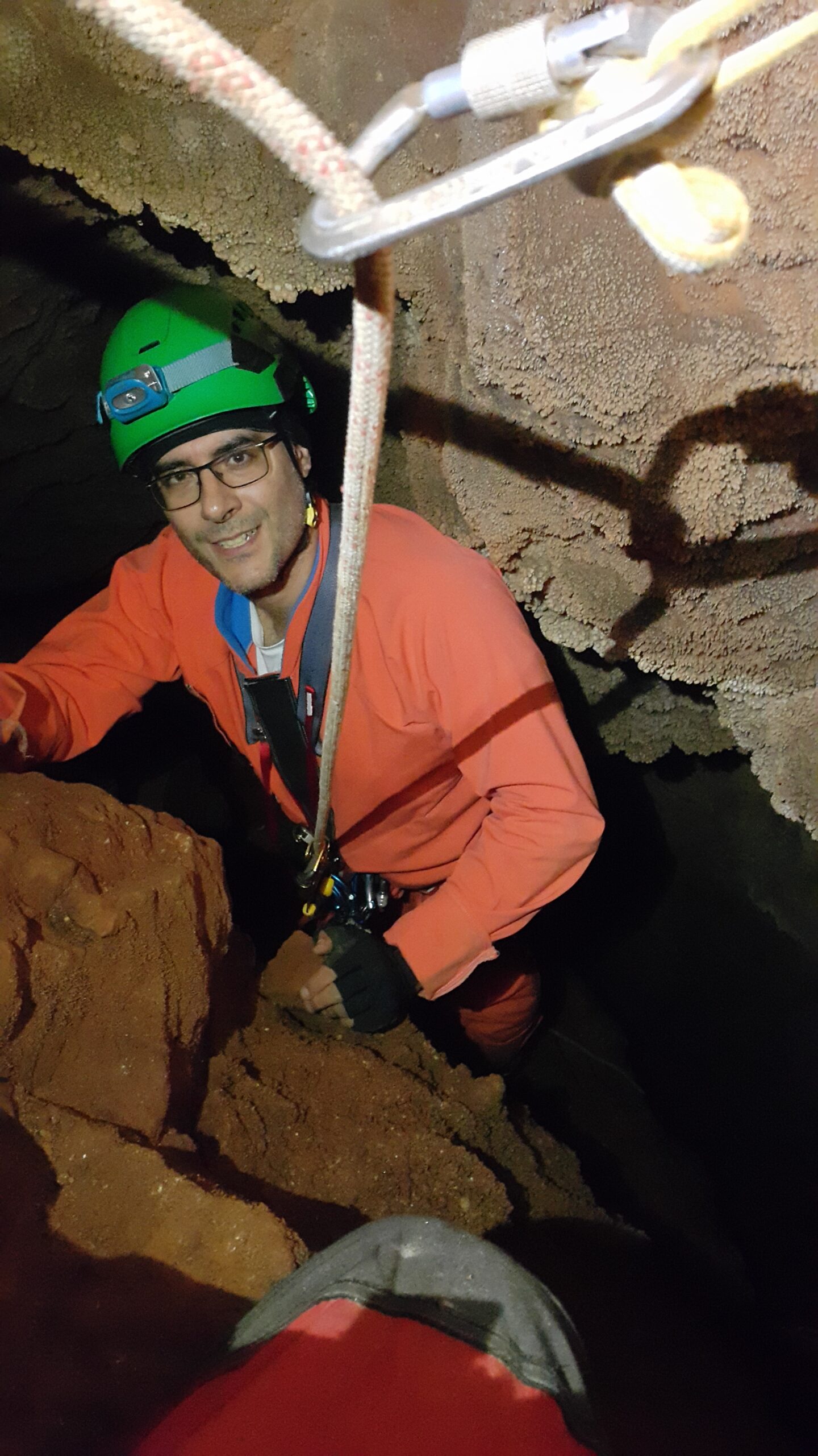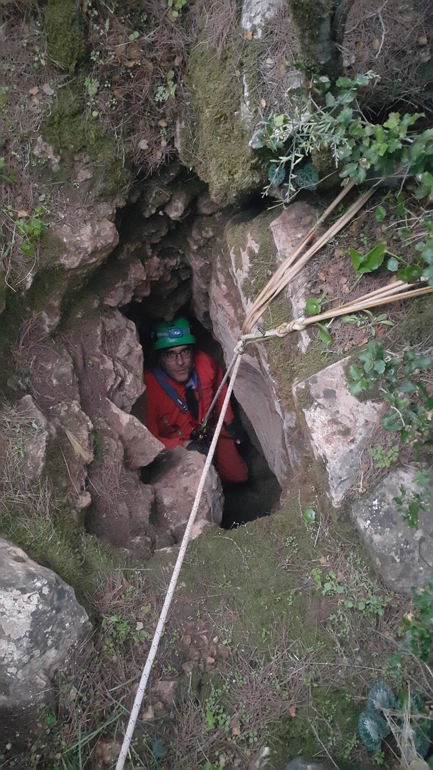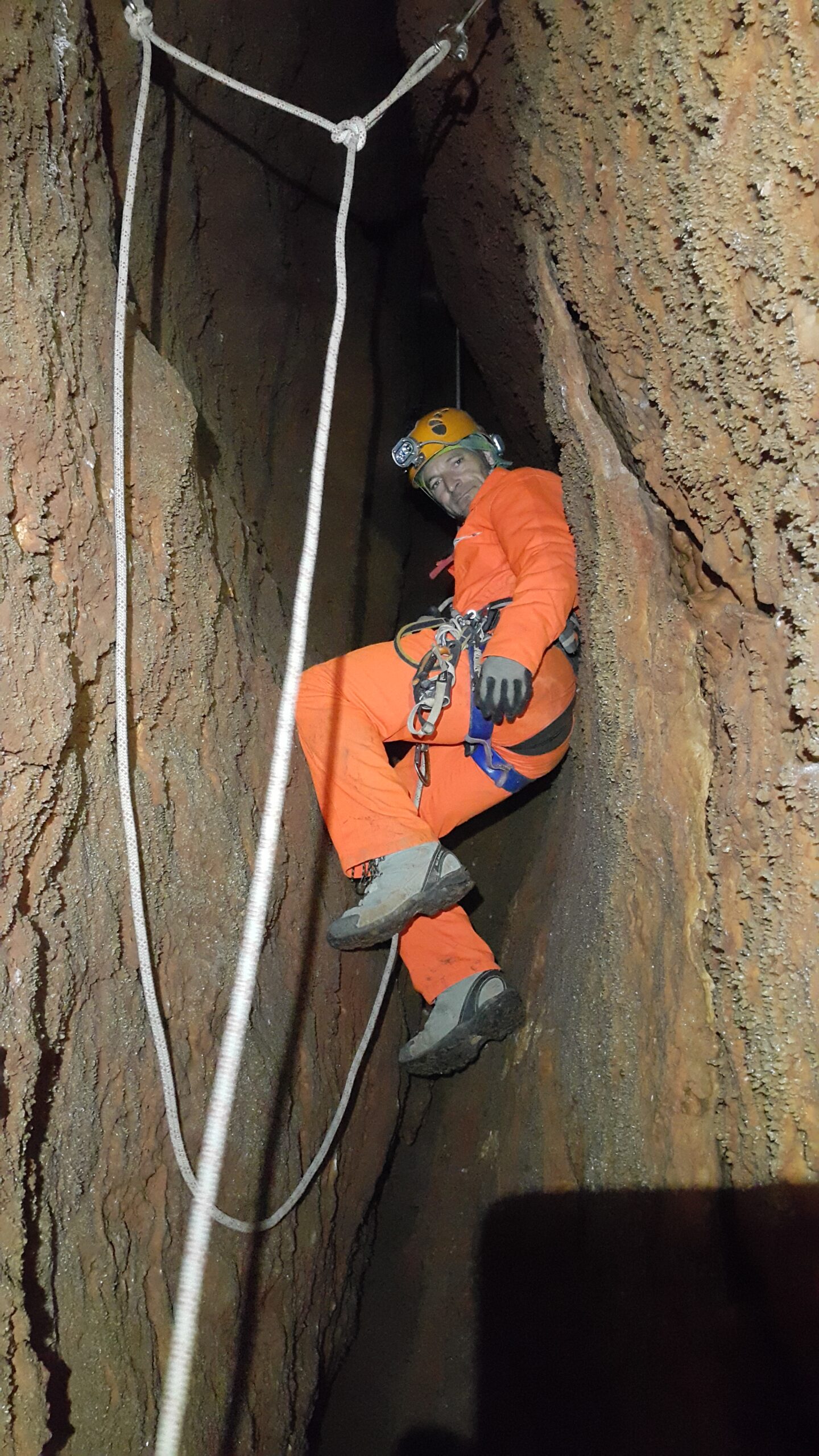 Στο χαμηλοτάβανο αυτό χώρο, υπήρχαν τα ίχνη από προηγούμενες καταβάσεις, με δύο τοποθετημένα αυτοδιάτρητα βύσματα που ήταν ακόμα λειτουργικά, αλλά δεν είχαμε δεί άλλα αρματώματα προς τα κάτω και το βάθος είναι κάπου 20 μέτρα. Το αρματώσαμε και κατεβήκαμε, καταλήγοντας σε ένα διάδρομο φάρδους 30-40, ή το πολύ 50 εκατοστά σε κάποιο σημείο, με μήκος 3-4 μέτρα κι έτσι, έστω και με το ζόρι κατεβήκαμε και οι πέντε.