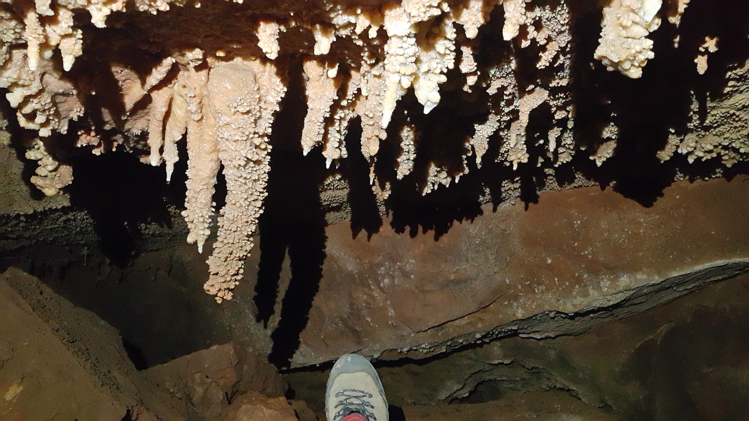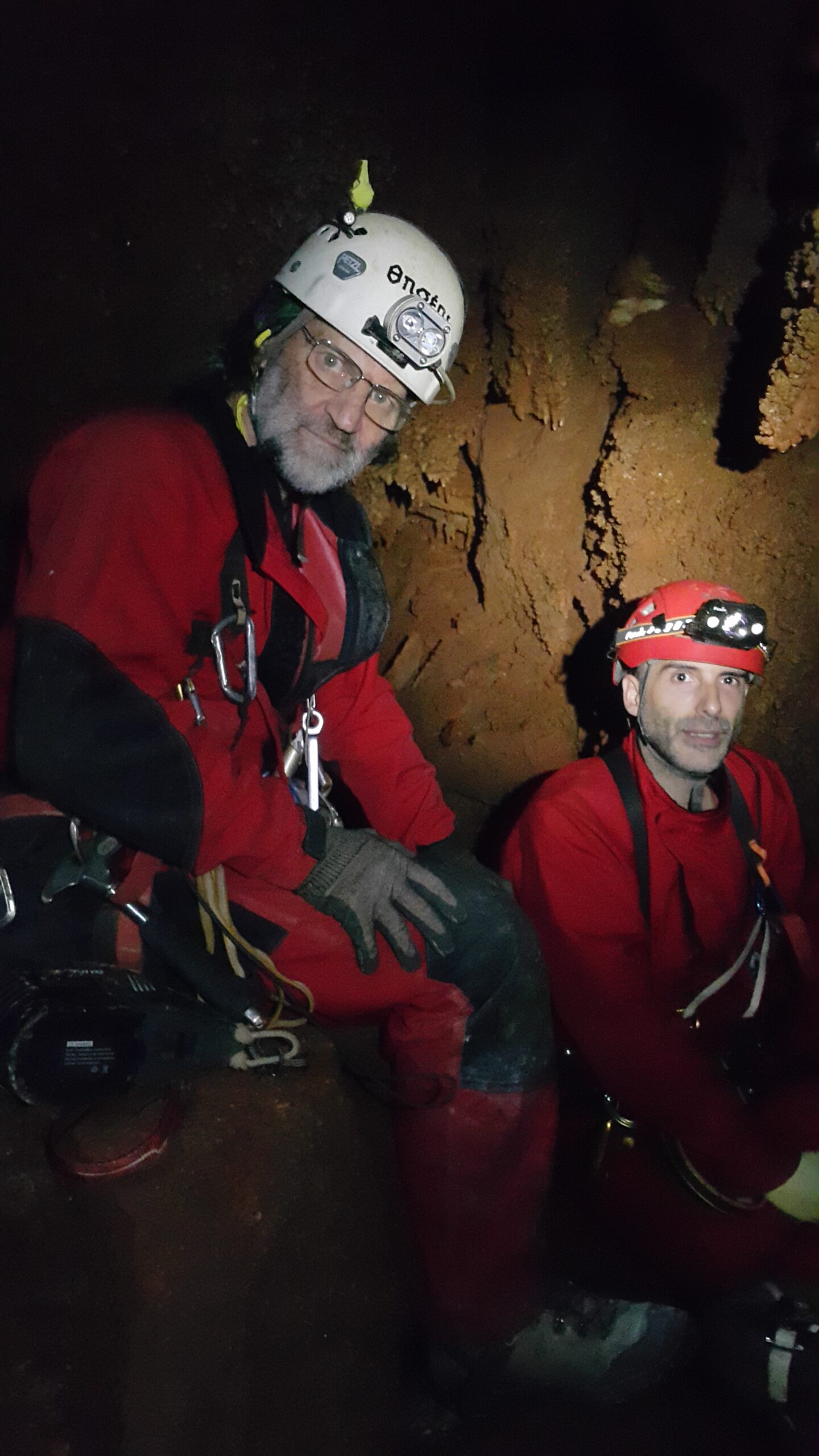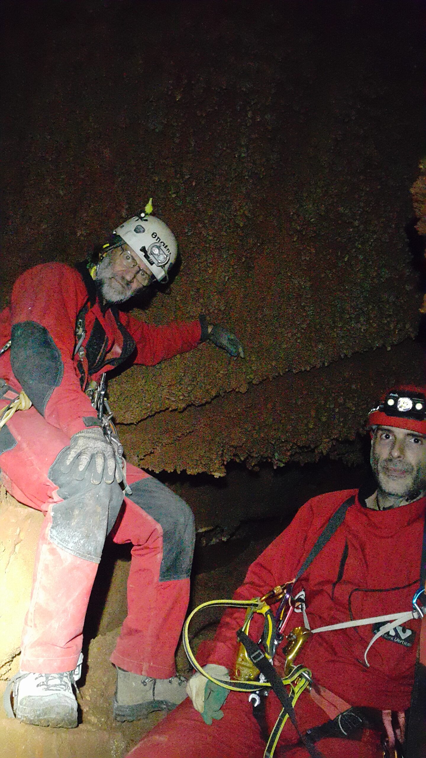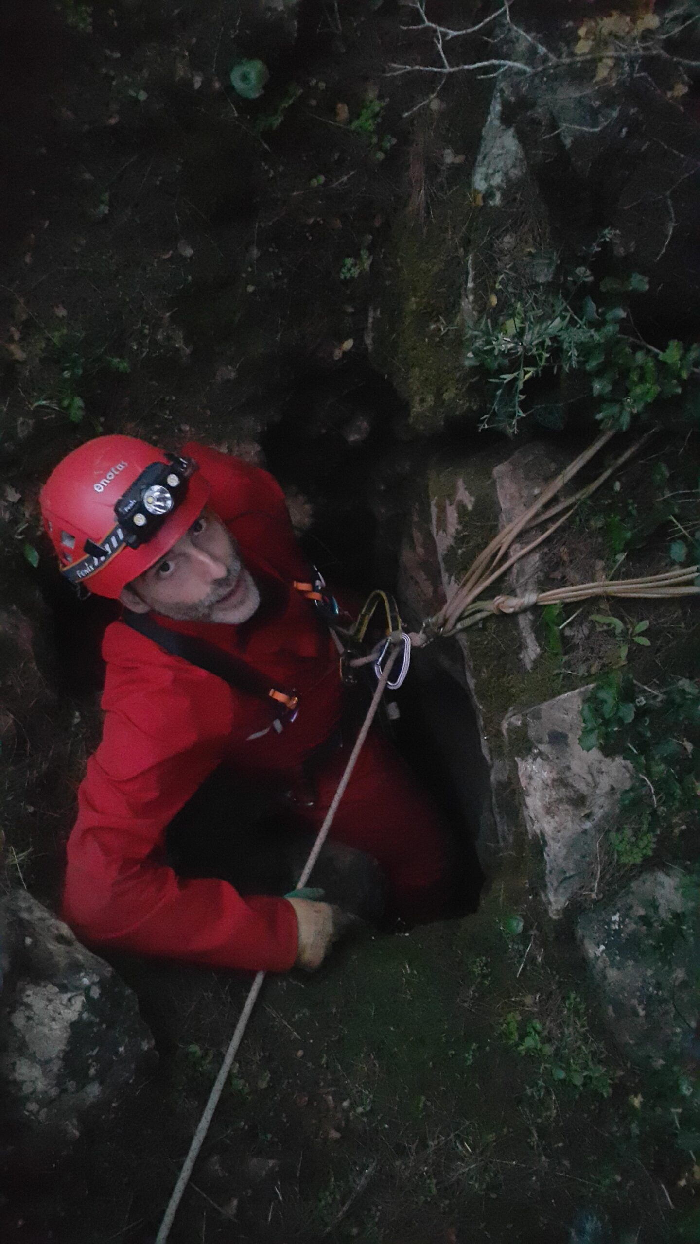 Στο χαμηλοτάβανο αυτό χώρο, υπήρχαν τα ίχνη από προηγούμενες καταβάσεις, με δύο τοποθετημένα αυτοδιάτρητα βύσματα που ήταν ακόμα λειτουργικά, αλλά δεν είχαμε δεί άλλα αρματώματα προς τα κάτω και το βάθος είναι κάπου 20 μέτρα. Το αρματώσαμε και κατεβήκαμε, καταλήγοντας σε ένα διάδρομο φάρδους 30-40, ή το πολύ 50 εκατοστά σε κάποιο σημείο, με μήκος 3-4 μέτρα κι έτσι, έστω και με το ζόρι κατεβήκαμε και οι πέντε.